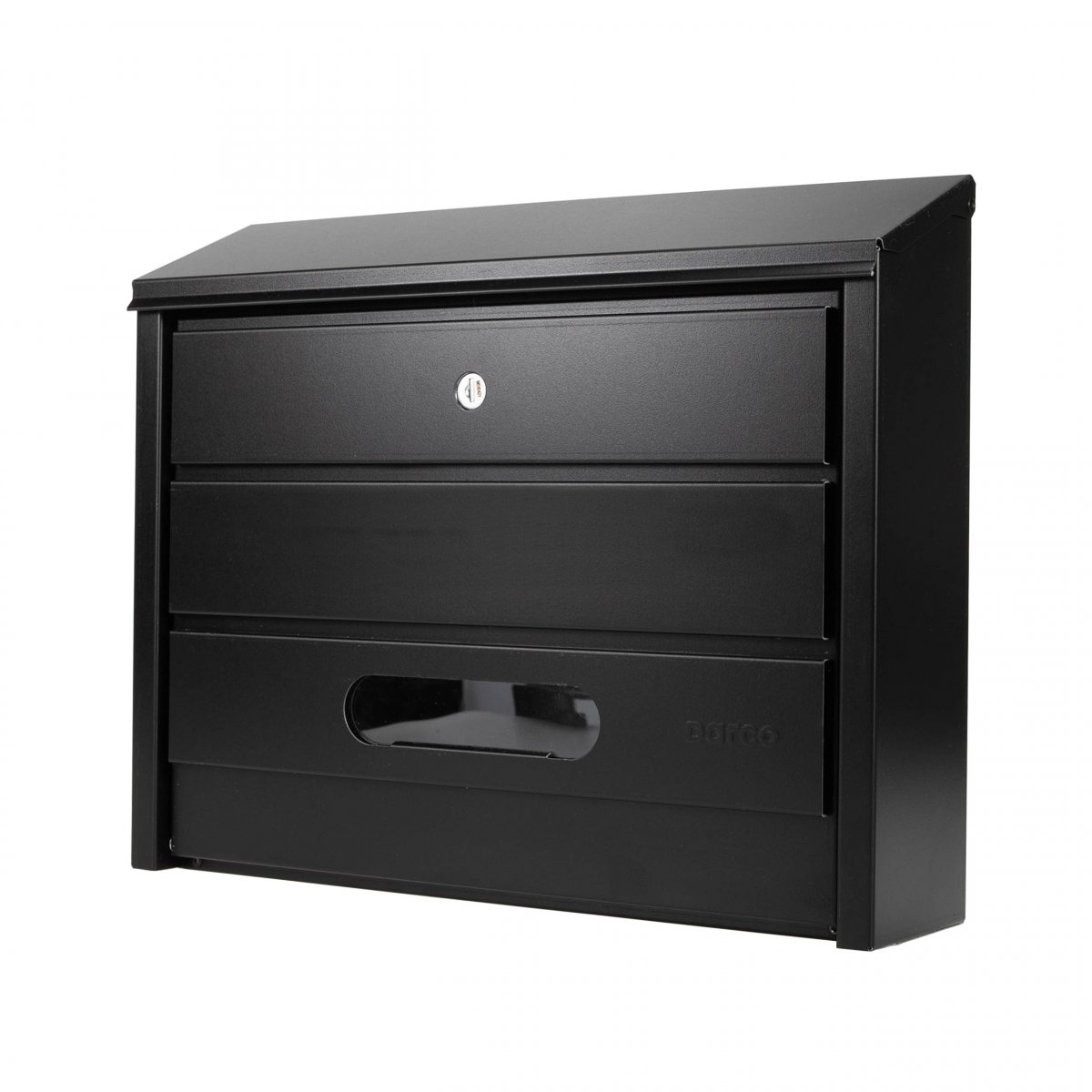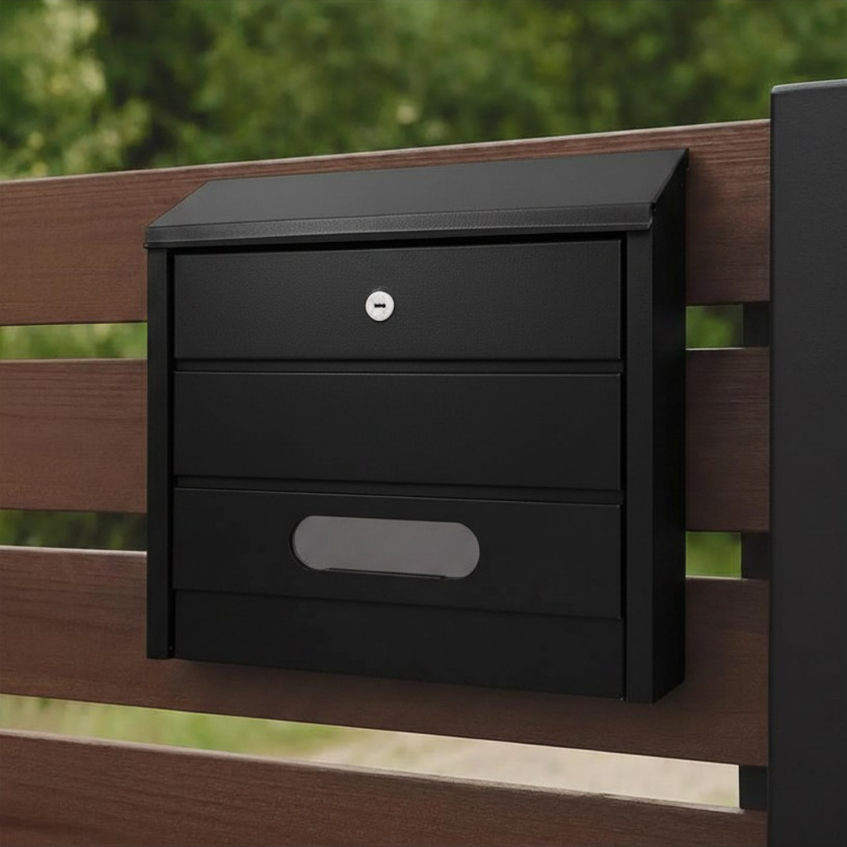 Praktická poštovní schránka v matné černé barvě vhodná pro venkovní i vnitřní montáž. Vyrobena z odolného akrylového plechu, který zajišťuje dlouhou životnost a odolnost vůči povětrnostním vlivům. Součástí je zámek se dvěma klíči a montážní sada.